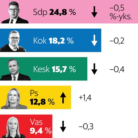 HS-gallup|Perussuomalaisten kannatus nousi 12,8 prosenttiin, mutta keskusta on yhä noin kolme prosenttiyksikköä edellä.